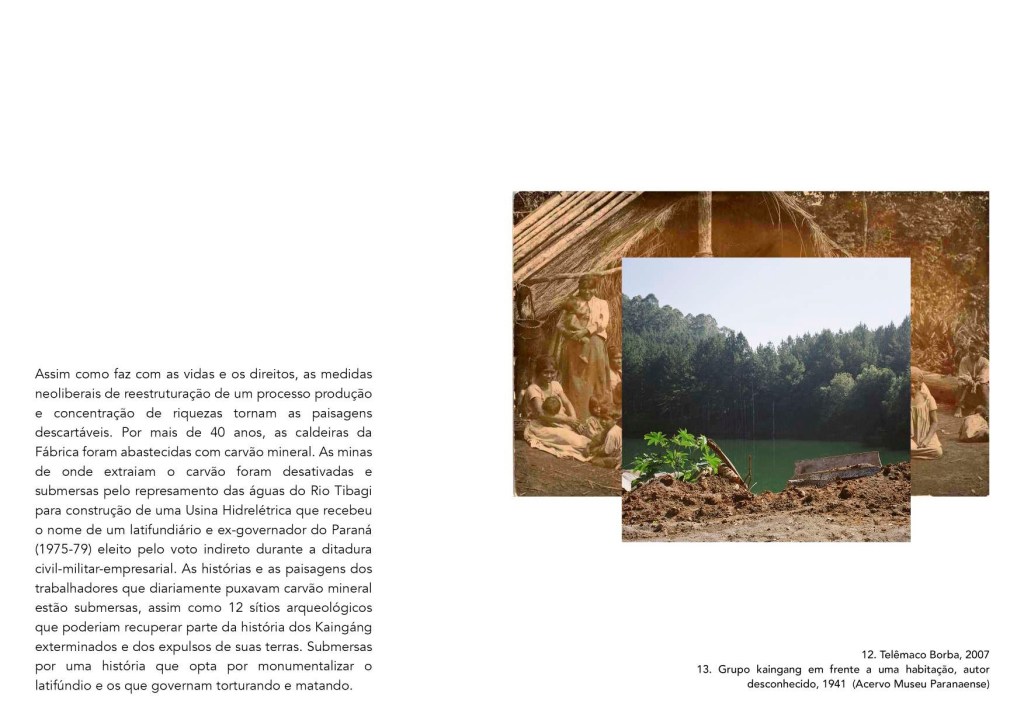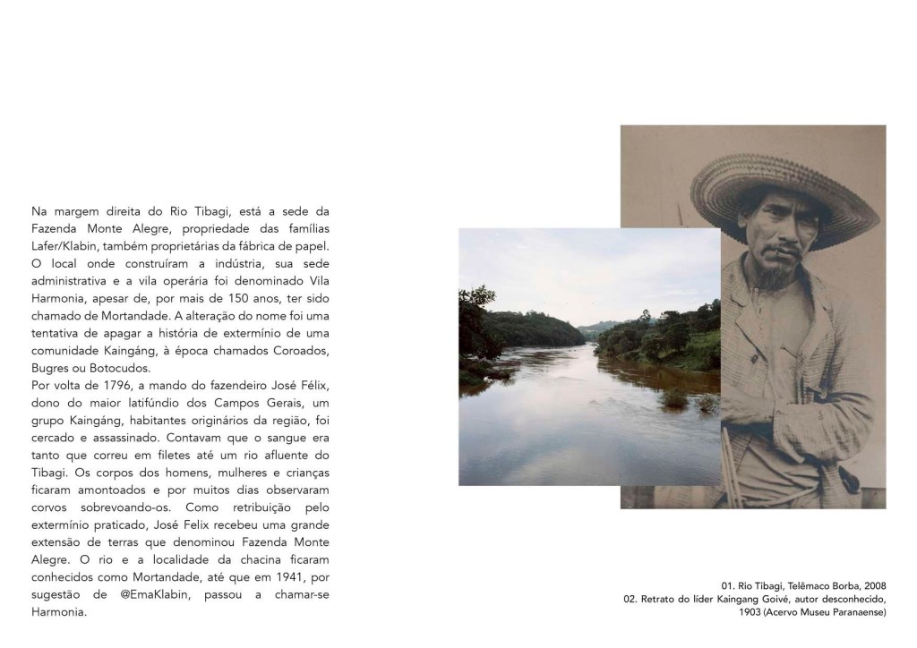 A história “oficial” registra a transmissão e manutenção do poder econômico como os nomes dos fazendeiros da região desde antes do extermínio kaingáng e nos permite considerar os donos da fábrica como sucessores dos donatários do século XVIII. Da outra parte da história, a dos indígenas e dos operários, os relatos e imagens são praticamente inexistentes. Haveria alguma relação entre a população da região, trabalhadores da fábrica e os kaingáng? Estes fios soltos algum dia foram parte de uma mesma trama?