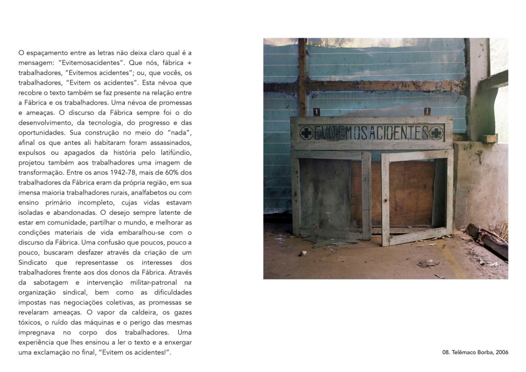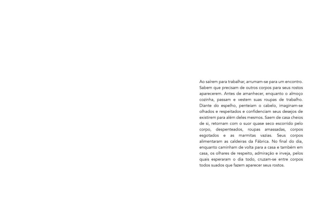 Fábrica (Campo de Batalha) apresenta um atravessamento de histórias, pessoas e paisagens cujas distâncias correspondem a mais de 200 anos: a do extermínio de uma comunidade Kaingáng (1796) e de uma classe operária (a partir dos anos 1940) em um território ocupado e controlado por uma grande fábrica de papel, na cidade de Telêmaco Borba-PR.